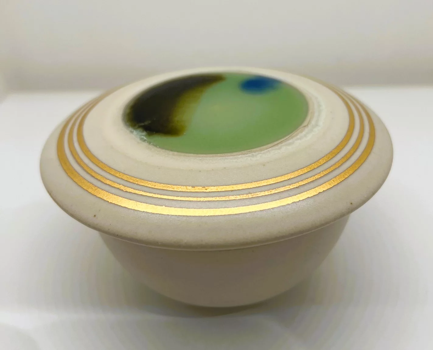 Deckeldose mit Glaseinschmelze und feinen Goldstreifen auf dem Deckel.