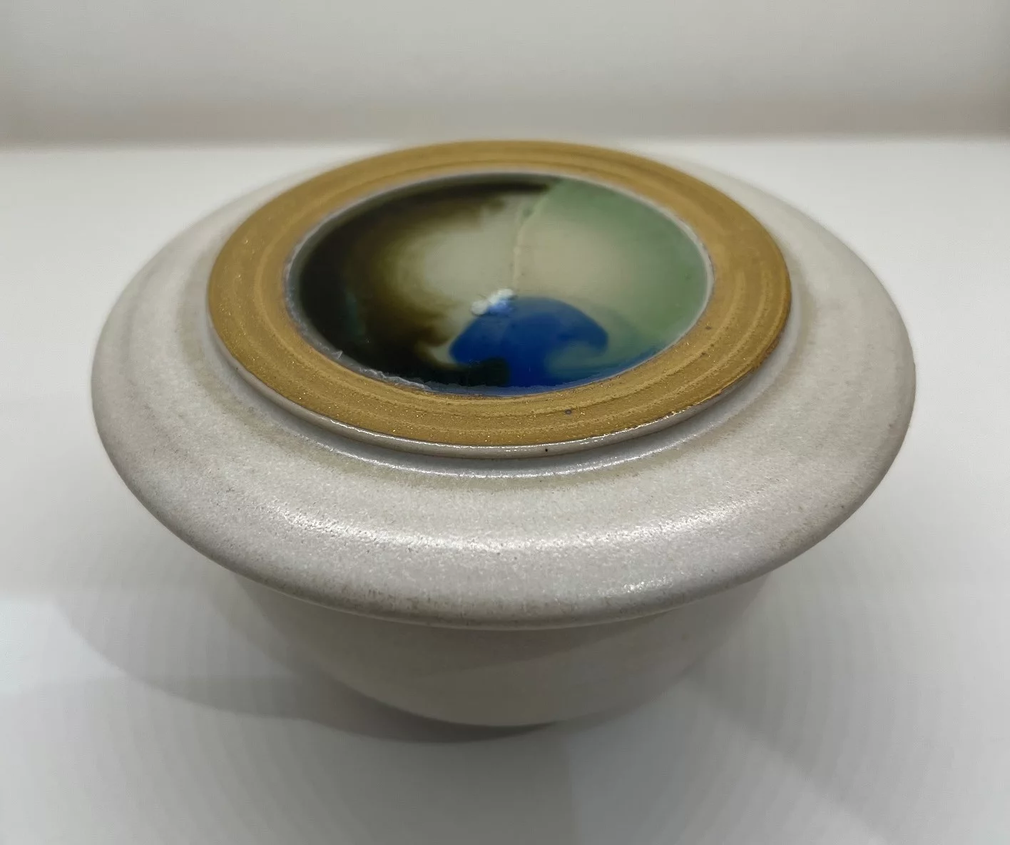 Im Deckel der Dose sind verschiedenfarbige Gläser mit eingeschmolzen. Die Glasfäche zeigt interessante Risse, welche wie Craquelèe anmuten und gewollt sind.