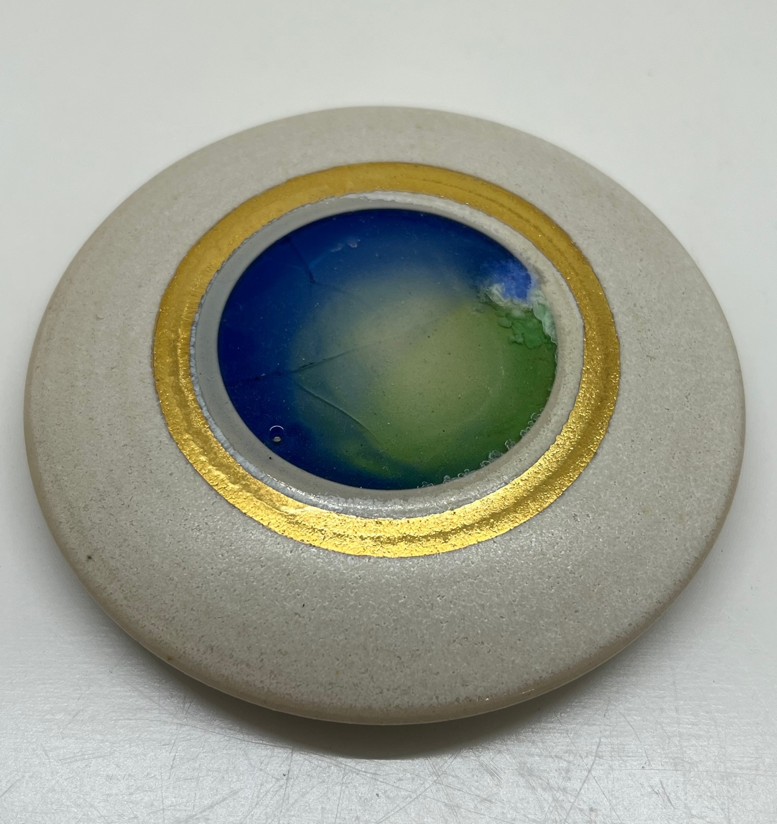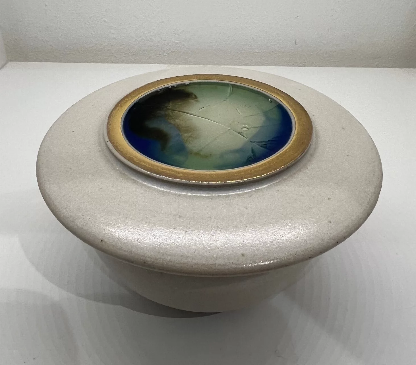 Verschiedene Gläser sind im Deckel verschmolzen und geben dem Stück durch ihre Farbigkeit und Craquelèerisse ein interessantes Aussehen.